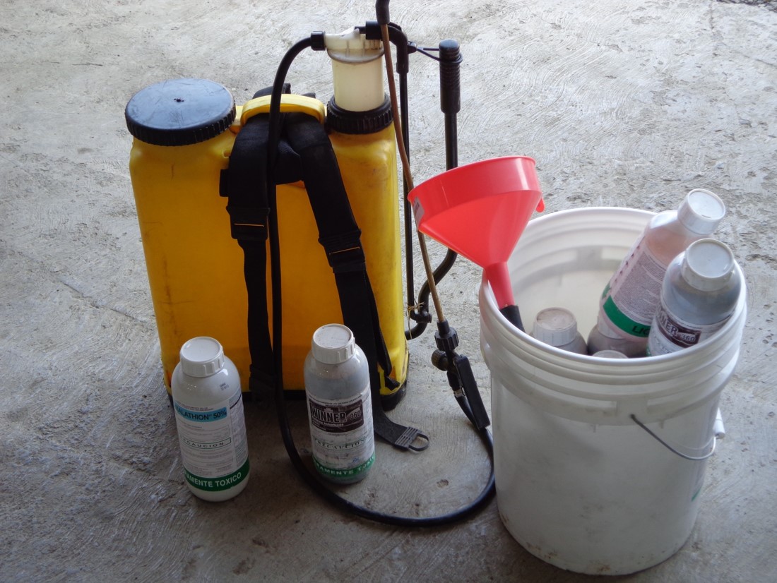 Esta actividad se implementa en base a los resultados del trampeo y muestreo de frutos y se utiliza un mezcla de 1 litro de Malathion 50 más 4 litros de un atrayente alimenticio que es la proteína hidrolizada en 95 litros de agua, siendo asperjada dicha mezcla con aspersora manual o cuatrimoto aplicando 50 a 80 mililitros por árbol dirigidas al follaje de la parte media a la parte alta de la copa al lado donde el sol sale y se lleva a cabo en hileras alternas, es decir, una si y otra no, en la siguiente semana se aplica en la línea donde no se aplicó. Se repiten las aspersiones cuantas veces sean necesario hasta al final de la cosecha. La periodicidad entre cada aplicación es de 7 días. Además en las épocas de lluvias se apoya esta actividad con la instalación de estaciones cebos 25 por ha.