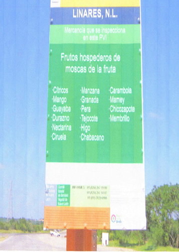 En el Estado de Nuevo León se tiene implementado un Punto de Verificación Interna en el municipio de Linares, N.L. siendo la principal actividad la revisión de los autotransportes para detectar la presencia de frutas o vegetales y preceder de acuerdo a los Lineamentos Federales en materia, con el objetivo de proteger los estatus de zonas libres de moscas exóticas de la fruta de importancia cuarentenaria como así también zonas de baja prevalencia de moscas de la fruta de importancia económica.
